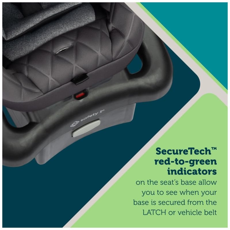 A base do assento do carro utiliza os conectores Safety 1st onBoard InstaLatch, que permitem uma instalação rápida e segura. Indicadores SecureTech na base mudam de vermelho para verde, proporcionando confiança de que a cadeirinha está instalada corretamente. A altura da base pode ser ajustada para garantir um encaixe perfeito no seu veículo.