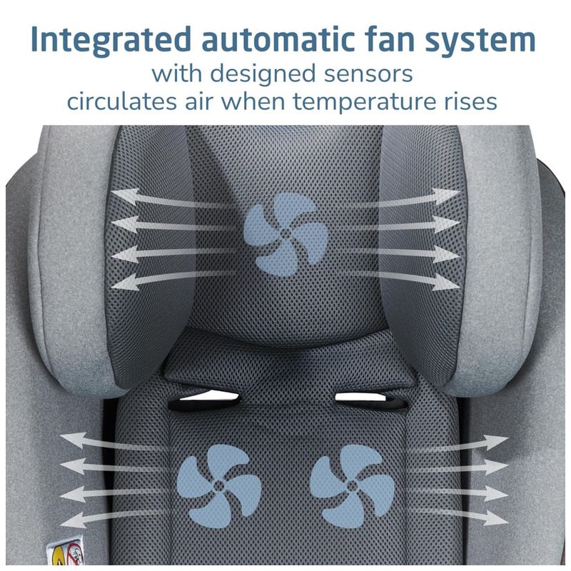 A Cadeira de Carro Mais Fresca da Cidade: O acolchoamento especial de células abertas e o tecido de malha macia e respirável proporcionam uma circulação de ar otimizada ao redor do seu filho. Com dois ventiladores na região lombar e um no encosto de cabeça, o Pria Chill oferece conforto incomparável para tornar cada passeio mais agradável.