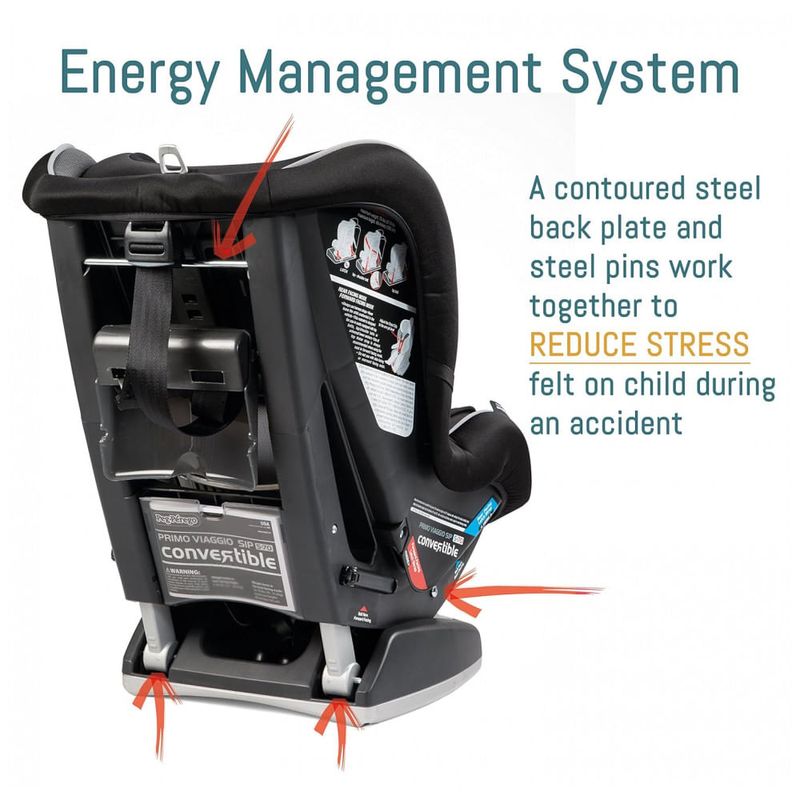Uma placa traseira de aço com contornos minimiza a flexão e reduz o movimento para frente após o impacto. Os pinos de aço coletam energia e cavam na base do assento para reduzir o estresse sentido em uma criança.