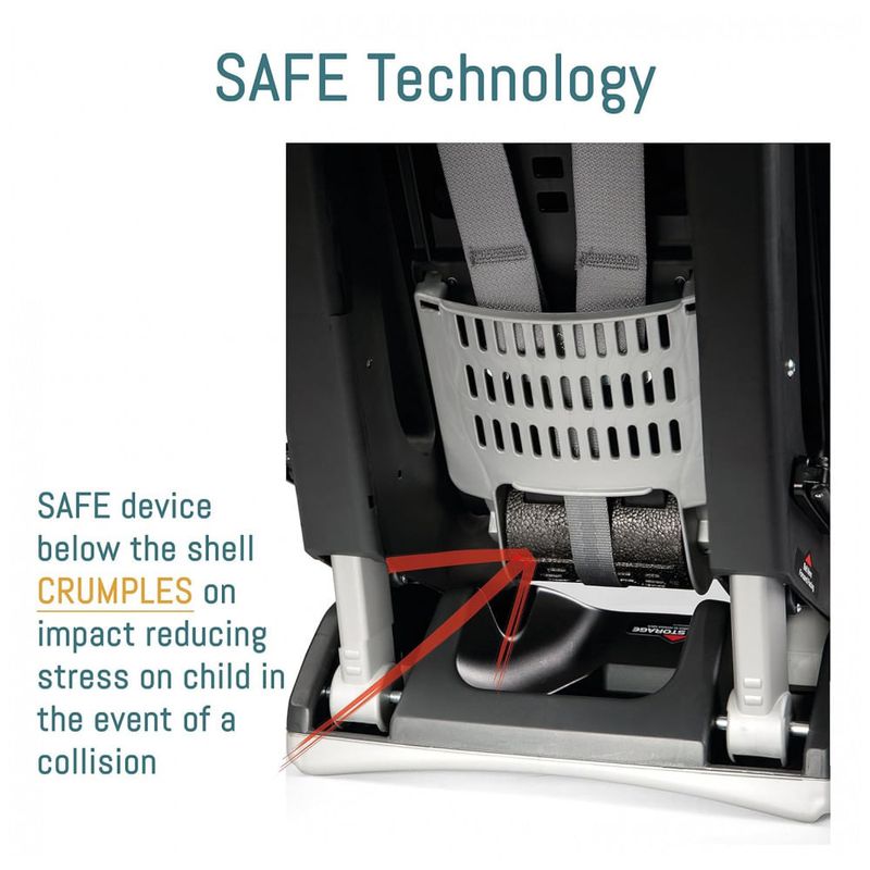 O assento também conta com espuma absorvente de energia EPS em todo o seu interior, que protege a cabeça e o tronco da criança das forças de impacto em caso de acidente. Além disso, há um dispositivo de elemento de espuma absorvente de choque localizado abaixo da casca, que desmorona após o impacto, reduzindo o estresse no pescoço e nos ombros da criança.
