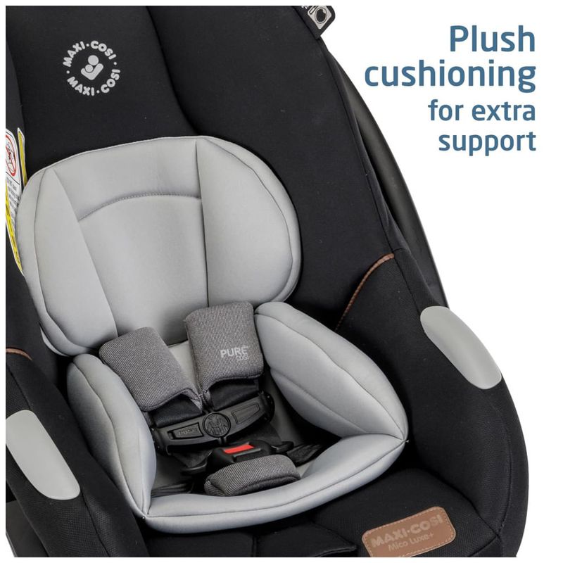 O Mico Luxe Essential é especialmente projetado para conforto, com acolchoamento macio e luxuoso na cabeça removível do bebê e nas inserções lombares. Isso oferece suporte excepcional durante o passeio, minimizando o estresse para o seu bebê. O tecido e a espuma PureCosi da MaxiCosi são resistentes ao fogo e projetados para serem suaves na pele do bebê, além de serem mais amigáveis ao meio ambiente.