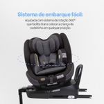 Sistema de embarque fácil: equipada com sistema de rotação 360º, que facilita tirar e colocar a criança da cadeirinha em qualquer posição.