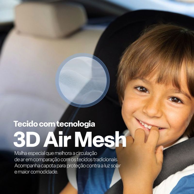 Tecido com tecnologia 3D Air Mesh: malha especial que melhora a circulação de ar em comparação com os tecidos tradicionais. Acompanha capota para proteção contra a luz solar e maior comodidade.