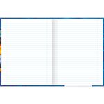 Este modelo de caderno brochura tem capa dura com a parte interna decorada, folha dupla de adesivos e folhas pautadas.