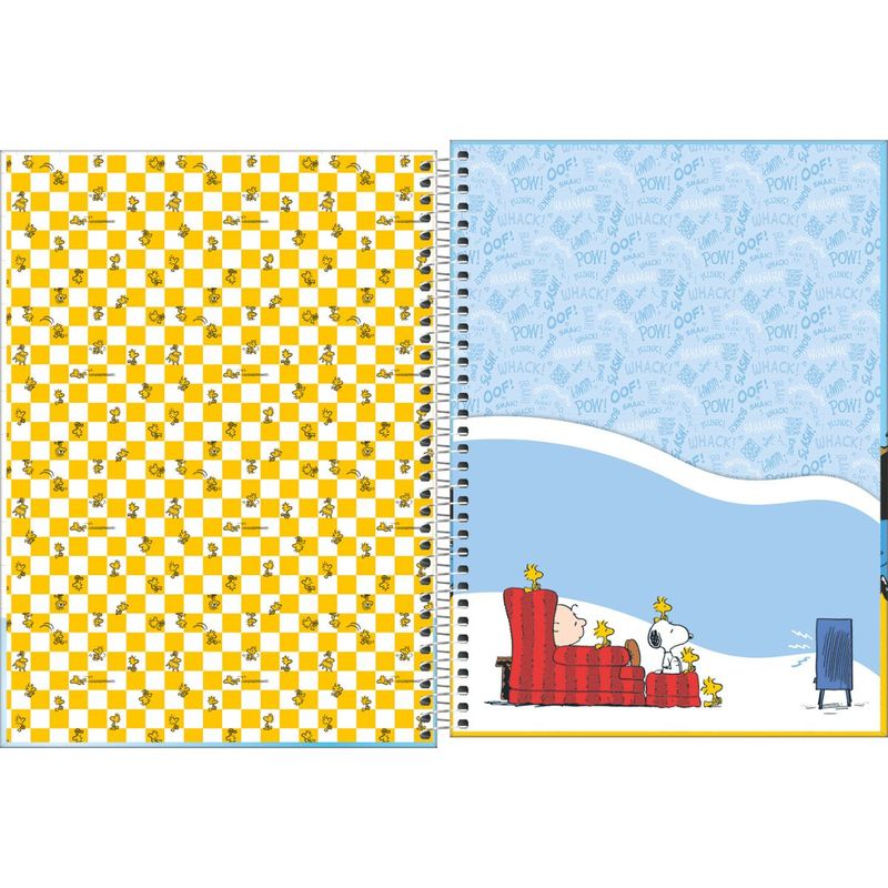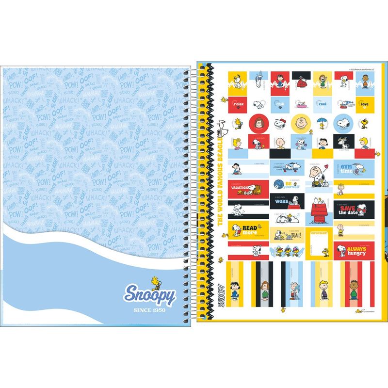 O Caderno Espiral Capa Dura Universitário 1 Matérias Snoopy 80 Folhas possui capa dura com a parte interna decorada, bolsa de papel decorada para guardar trabalhos e anotações e folha com adesivos funcionais.