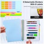 O sistema de organização inclui 5 divisórias móveis e 8 etiquetas autoadesivas, permitindo separar disciplinas, projetos ou temas diferentes no mesmo caderno. As folhas utilizam papel mais espesso, projetado para reduzir marcas de tinta no verso, contribuindo para melhor aproveitamento de ambos os lados da página.