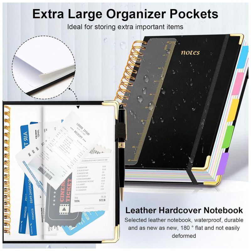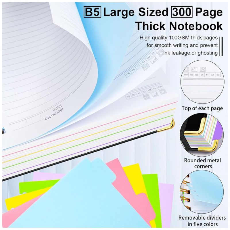 Este caderno universitário espiral GDGDSY em formato B5 8 x 10 oferece 5 seções organizadas em um único volume com 300 páginas pautadas, adequado para anotações extensas em estudos, trabalho e planejamento pessoal. A capa dura em couro sintético com cantos metálicos dourados reforçados protege o miolo contra desgaste diário e impactos leves na mochila ou pasta.