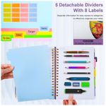 O sistema de organização inclui 5 divisórias móveis e 8 etiquetas autoadesivas, permitindo separar disciplinas, projetos ou temas diferentes no mesmo caderno. As folhas utilizam papel mais espesso, projetado para reduzir marcas de tinta no verso, contribuindo para melhor aproveitamento de ambos os lados da página.