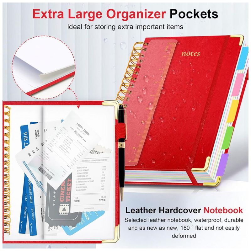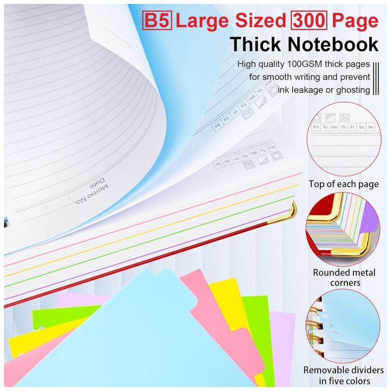 Este caderno universitário espiral GDGDSY em formato B5 8 x 10 oferece 5 seções organizadas em um único volume com 300 páginas pautadas, adequado para anotações extensas em estudos, trabalho e planejamento pessoal. A capa dura em couro sintético com cantos metálicos dourados reforçados protege o miolo contra desgaste diário e impactos leves na mochila ou pasta.