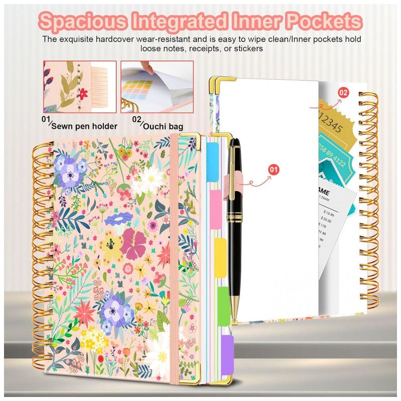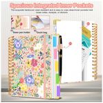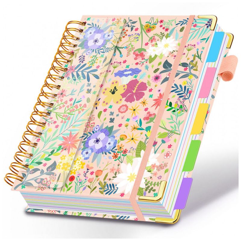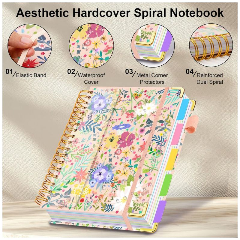 Este caderno universitário espiral HDhuiun em formato 8 x 10 oferece 300 páginas pautadas distribuídas em 5 seções, indicado para anotações extensas de estudo, trabalho e organização pessoal. A capa dura com estampa floral bege é resistente ao desgaste diário e pode ser limpa com facilidade.