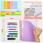 O caderno conta com divisórias coloridas removíveis com bolsos integrados, além de abas autoadesivas para marcação, permitindo organizar documentos, tarefas e matérias em um único volume. O elástico de fechamento mantém o caderno seguro quando transportado em mochilas ou bolsas, ajudando a preservar as páginas e documentos internos.