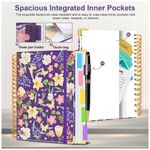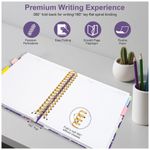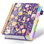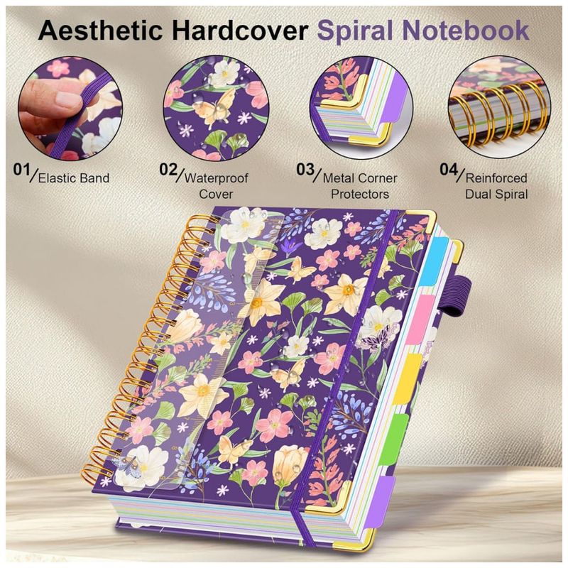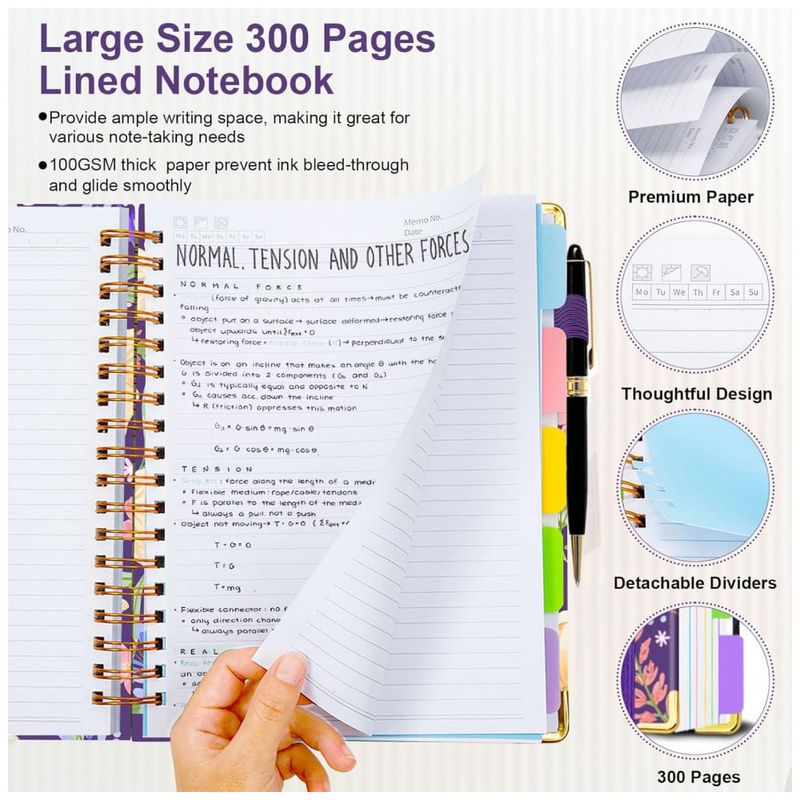 Este caderno universitário espiral HDhuiun em formato 8 x 10 oferece 300 páginas pautadas distribuídas em 5 seções, adequado para anotações em rotinas de estudo, trabalho e organização pessoal. A capa dura com estampa floral roxa é resistente ao uso diário e pode ser limpa com facilidade, contribuindo para maior durabilidade.