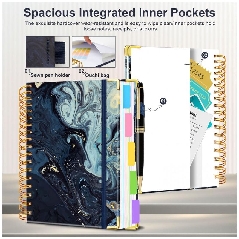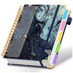 Este caderno universitário espiral HDhuiun em formato 8 x 10 oferece 300 páginas pautadas distribuídas em 5 seções, indicado para anotações de estudo, trabalho e organização pessoal. A capa dura com estampa de mármore azul marinho é resistente ao desgaste e pode ser limpa com pano seco ou levemente umedecido.