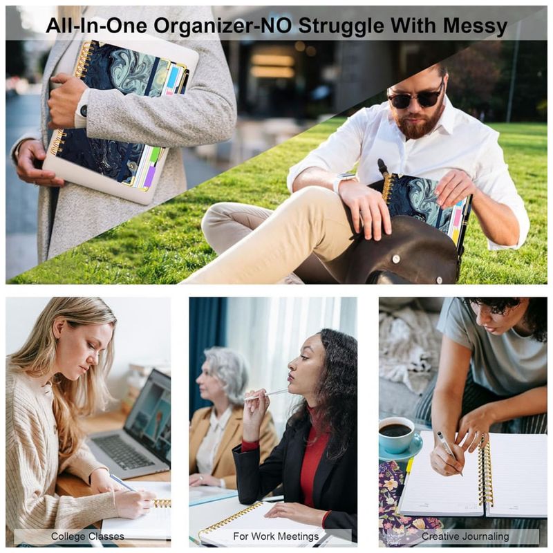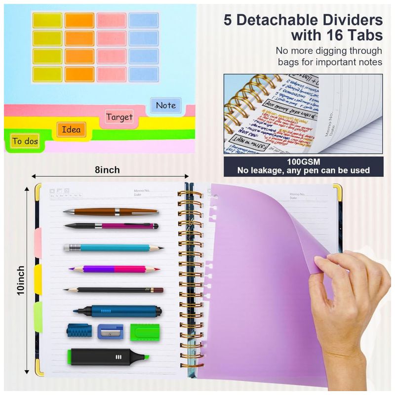 O caderno inclui divisórias removíveis coloridas com bolsos integrados e 16 abas autoadesivas, permitindo a separação de matérias, projetos e categorias em um único volume. Um elástico de fechamento mantém o caderno fechado durante o transporte, ajudando a proteger folhas soltas e documentos armazenados nos bolsos.