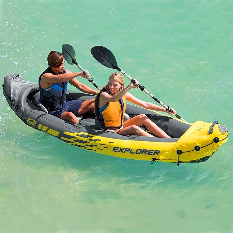 Caiaque inflável com capacidade para 2 pessoas. Seu inovador desenho favorece o processo de remar. Inclui quilha removível, assentos com encosto inflável e ajustáveis, remo de alumínio de 219cm, bomba manual e kit de reparação. Peso máximo 180Kg.Alem do conforto, seu design torna fácil o remar em ambos os lagos e rios suaves, tudo, permanecendo leve e compacto. Sua cabine de pilotagem dispõe de dois bancos ajustáveis com encostos. Feita de robusto vinil de calibre 30 super-resistente para maior durabilidade.