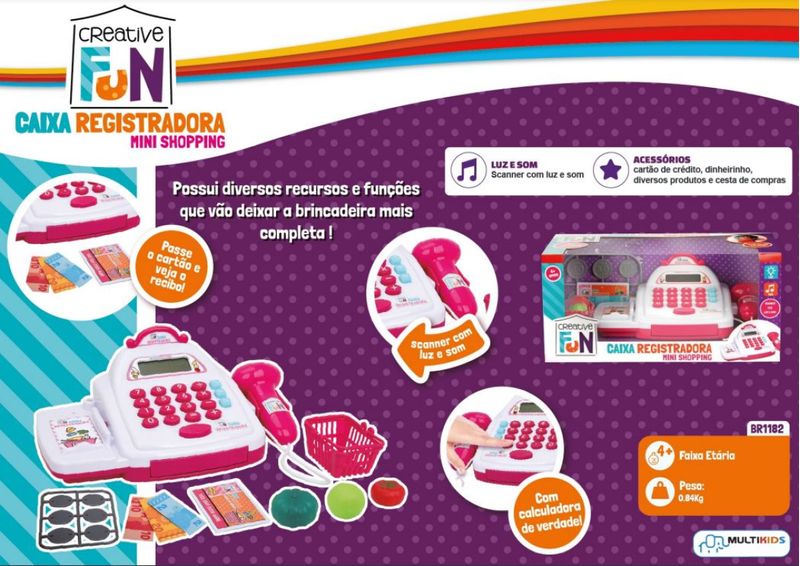 Com a nova caixa registradora a diversão está completa, com diversos recursos e funções que vão deixar qualquer um querendo entrar na brincadeira. Características: - Conteúdo da Embalagem: Não informado- Marca: Multikids- Modelo: BR1182- Dimensões da Embalagem: 33cm, 16cm, 15cm- Código de Barras: 7899838892740- Alimentação: Não informado- Certificação: INMETRO Recomendado para maiores de 4 anos. Importante: - Nossos produtos encontram-se em estoque- Todos os produtos são lacrados- Produtos acompanham nota-fiscal e garantia