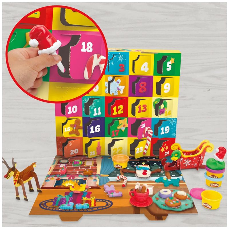 É a época das criações festivas com o Calendário do Advento de Natal Play-Doh! São 24 dias de surpresas com presentes para as crianças, incluindo pelo menos 1 lata de Play-Doh e acessório para uma atividade criativa a cada dia. Após abrirem cada porta perfurada, terão um total de 28 ferramentas Play-Doh e 24 latas de 28g de massa para continuar brincando e criando o ano inteiro. A caixa também apresenta 3 artesanatos em papel, 4 cartões com ideias e um tapete de papel desdobrável para mais formas de brincar. É o calendário perfeito para a contagem regressiva de Natal para crianças que adoram brincadeiras sensoriais e expressar suas grandes imaginações! Aventure-se na imaginação a cada dia de dezembro com este calendário do advento Play-Doh para meninas e meninos de 3 anos ou mais. Divirta-se com atividades de artes e ofícios todos os dias. Uma variedade de ferramentas de Play-Doh divertidas permite que as crianças criem formas festivas como bengalas de doces, biscoitos, flocos de neve e muito mais. Cada porta contém uma lata de 28g de massa modeladora Play-Doh com cores brilhantes como diferentes tons de azul, vermelho, verde e roxo. As crianças podem montar uma rena, um trenó e uma árvore de Natal com as peças perfuradas na caixa. Crie um cenário de inverno aconchegante com o tapete de papel dentro da aba da embalagem e divirta-se com atividades correspondentes para continuar brincando e criando durante toda a temporada de festas.