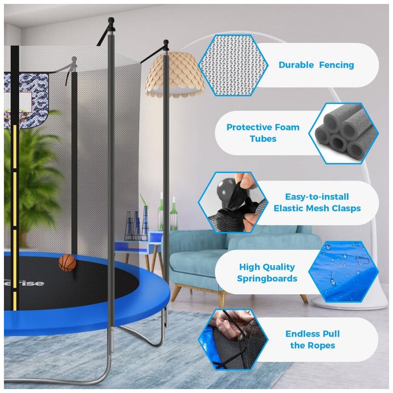 Desempenho aprimorado da mola Melhoramos as características de cada mola. Cada mola tem agora aproximadamente 1,8 milímetros de espessura e 86,43 milímetros de comprimento, o que é um terço mais forte do que o trampolim comum. O trampolim interno infantil pode aumentar a elasticidade de todo o trampolim e garantir a segurança da criança.