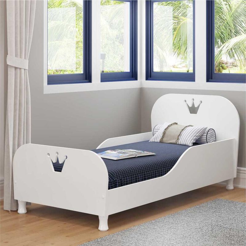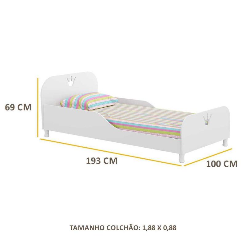 Descubra o conforto e a sofisticação da Cama Solteiro com Colchão Incluso 88 x 188cm 100% MDF Realeza Multimóveis! Com acabamento em pintura UV e Laca PU, esta cama oferece um toque de requinte ao quarto dos sonhos. O colchão D23 macio garante noites tranquilas de sono, além de possuir tratamento anti-ácaro e anti-alérgico para cuidar da saúde do seu bem mais precioso. A Cama Realeza Multimóveis é produzida em material resistente e durável, sendo 100% MDF e suporta até 90kg. Seu acabamento em pintura UV e Laca PU proporciona uma beleza única que encanta à primeira vista. Além disso, a cabeceira e peseira contam com detalhe de uma coroa que confere charme extra à peça. As barras laterais de proteção garantem segurança para as crianças durante o sono. Versátil, pode ser utilizada com pés ou montada diretamente no chão seguindo o estilo montessoriano – ideal para estimular autonomia desde cedo na vida dos pequenos.