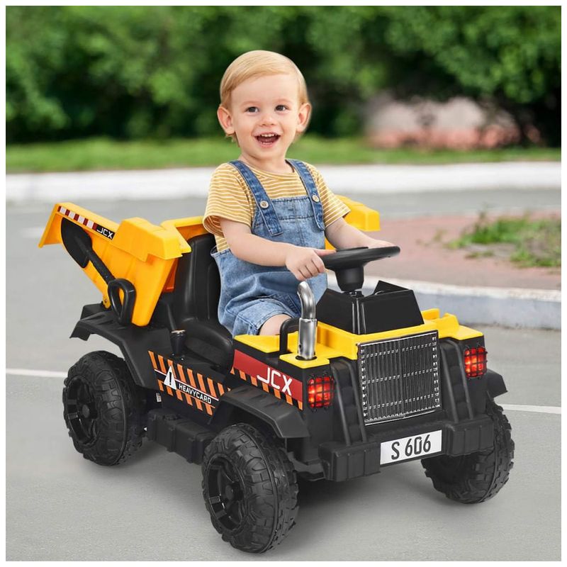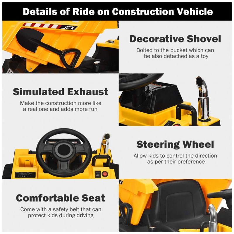 Cama basculante automática para cima e para baixo: Este brinquedo elétrico de veículo de construção apresenta a cama basculante traseira que sobe e desce automaticamente pressionando um botão. As crianças podem controlar o carro para transportar areia e carga no quintal. Eles não apenas terão horas de diversão, mas também rão o processo de aprendizado. Ajuda a melhorar a coordenação mão olho, capacidade cognitiva e habilidades motoras.