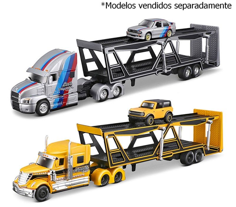 Caminhão Carreta Cegonha + CarroMarca do produto: Maisto.Coleção: TransportersEscala: 1/64Tamanho:- Caminhão Cegonha: 35 cm de comprimento- Carro: de 6,5 a 7,5 cm de comprimentoMiniatura em Metal com partes de Plástico.Contem: 1 Caminhão Carreta Cegonha e 1 Carro*Modelos Vendidos Separadamente