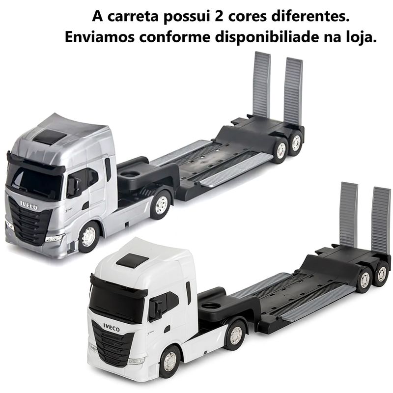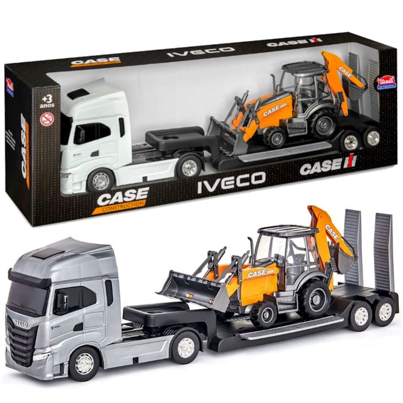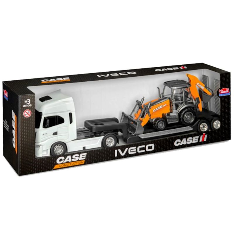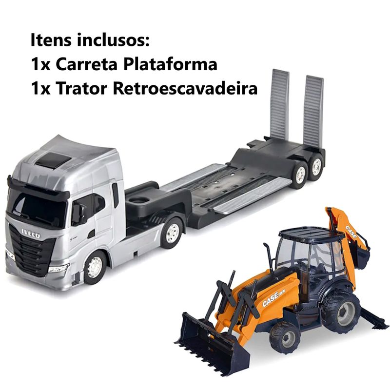 Brinquedo Caminhão Carreta Plataforma Iveco Hi-Way com Retroescavadeira Case