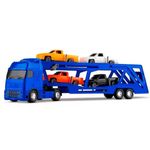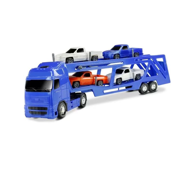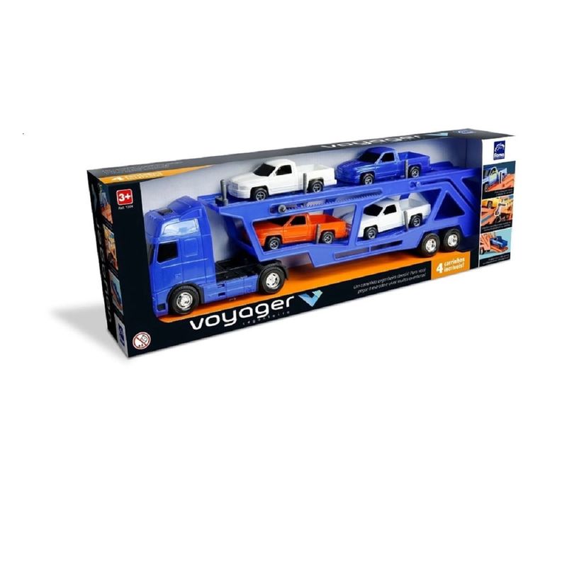Caminhão Voyager Cegonheira da marca Roma, muito semelhante ao caminhão Cegonheira de verdade. Cegonheira possui 64cm e vem acompanhada de 4 caminhonetes de cores sortidas.