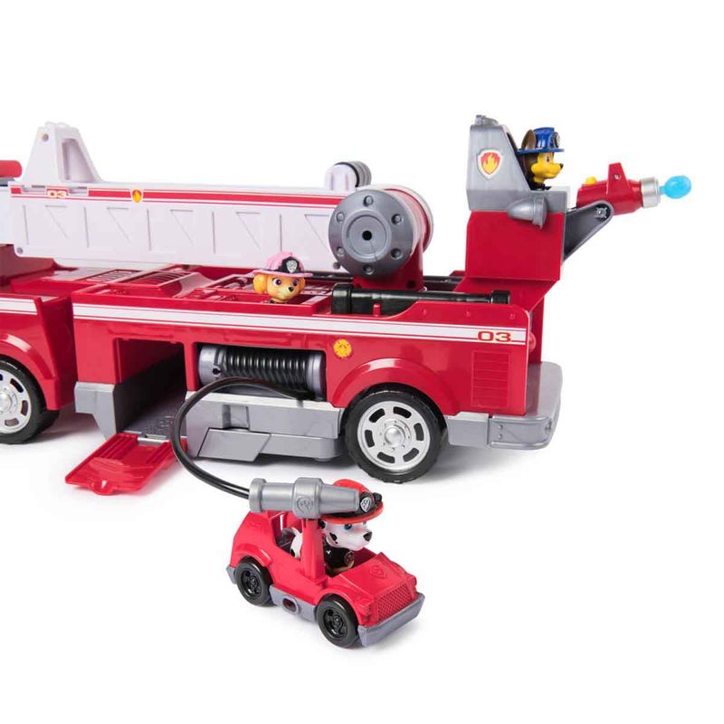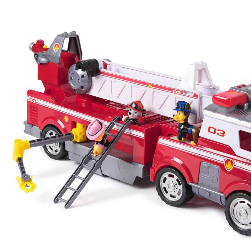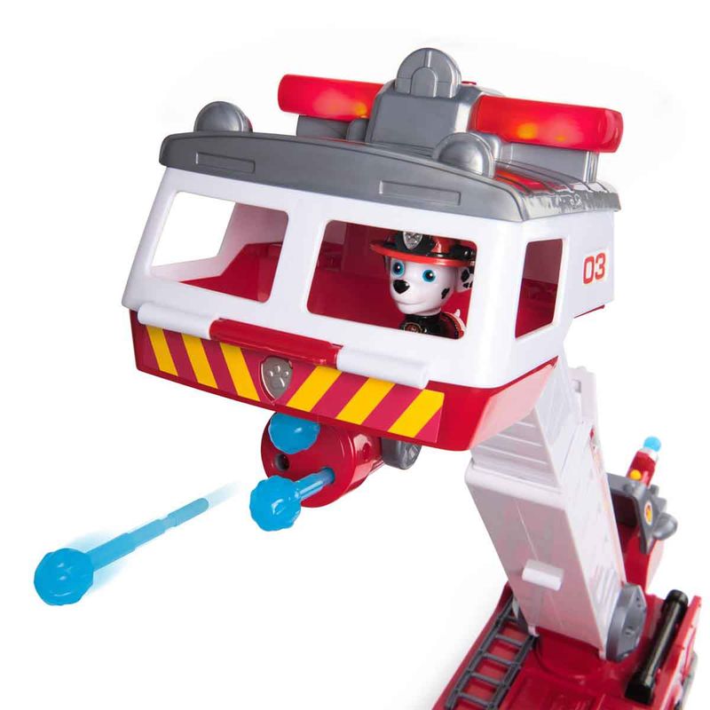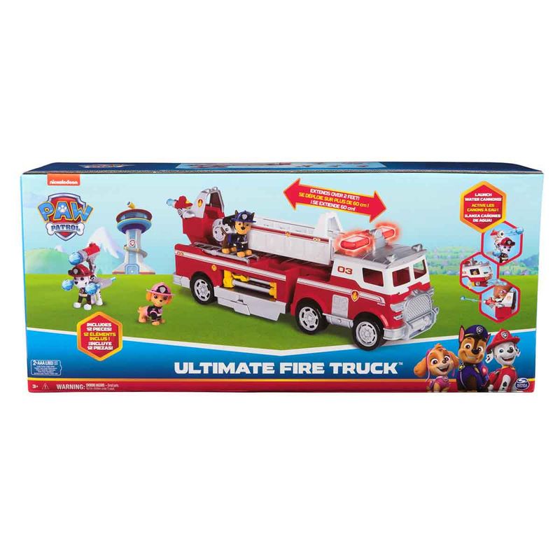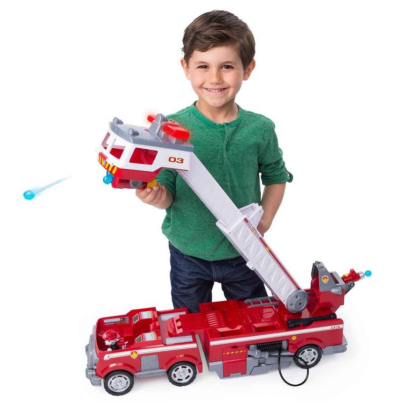 Salve o dia com o Caminhão de Bombeiros Ultimate do Marshall! Equipado com uma escada extensível de 60cm, um mini carrinho de bombeiro, luzes e sons, este caminhão de bombeiros está pronto para missões cheias de ação! Use os lançadores de canhões d’água na frente e na traseira deste veículo para apagar incêndios! O conjunto ainda inclui 3 figuras dos seus filhotes favoritos: Chase, Marshall e Skye.
