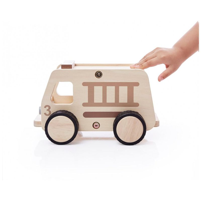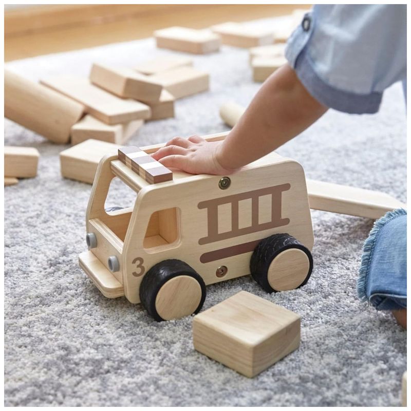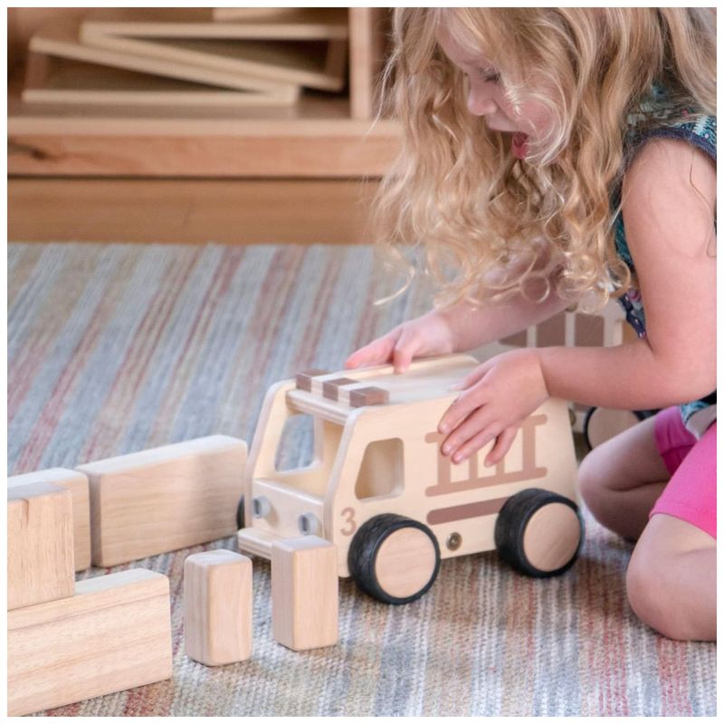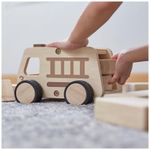 Estrutura em compensado de bétula com design serigrafiado em tons naturais para integração com sistemas de blocos tradicionais, rodas de plástico macio com aderência antiderrapante para mobilidade em superfícies planas. Operação manual sem necessidade de baterias ou fonte de energia, forma de veículo tipo truck, unidade única com materiais plásticos e madeira combinados. Reforçado para uso durável em brincadeiras dramáticas, compatível com conjuntos Guidecraft de vias e edifícios.?