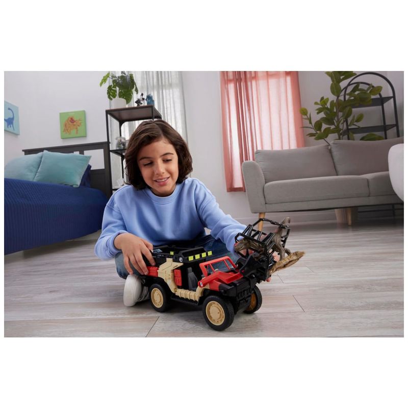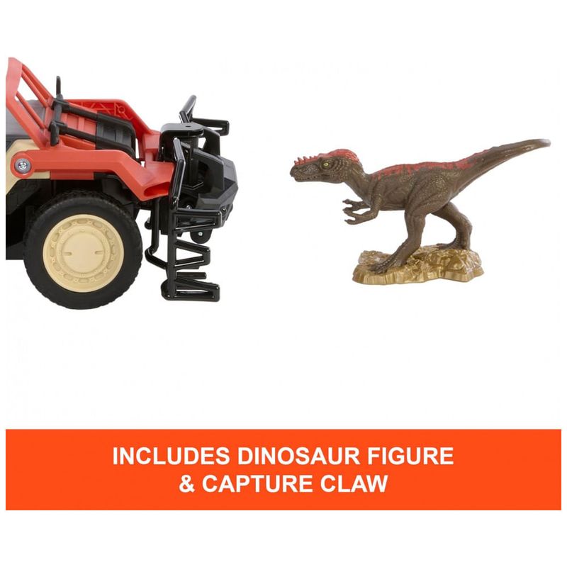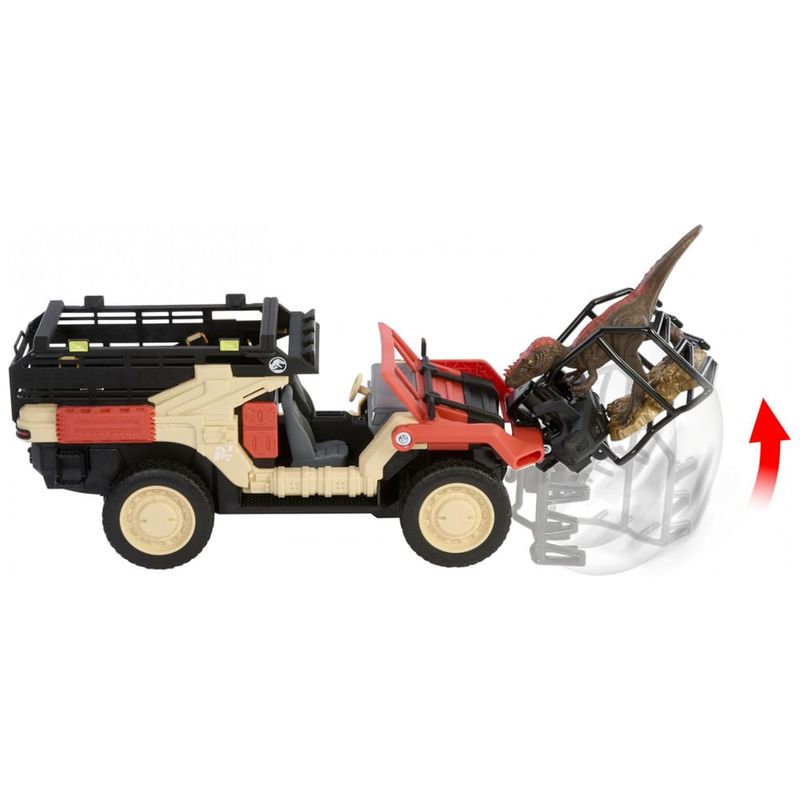 Na parte frontal, o caminhão conta com uma garra de captura que se projeta automaticamente para agarrar a mini figura de dinossauro incluída ao se aproximar dela. Após a captura, o sistema eleva o dinossauro até a área de jaula na traseira do veículo, onde ele fica acomodado para o “retorno ao laboratório” durante a narrativa.?
