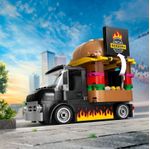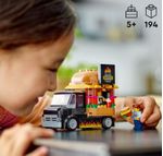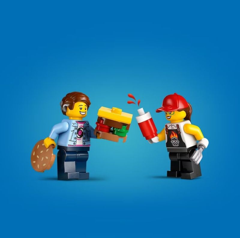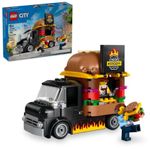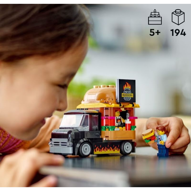 Conjunto de food truck de brinquedo LEGO® City para maiores de 5 anos • Caminhão de hambúrguer de brinquedo com 2 minifiguras, incluindo um cliente com um aparelho auditivo de brinquedo • Dobre a escotilha para servir os clientes e exiba uma placa de hambúrguer grelhado na chama • Salve o progresso, faça zoom entre e gire o modelo em 3D com o aplicativo LEGO® Builder • Um presente divertido ou uma surpresa para qualquer dia para crianças a partir de 5 anos • Aumente a diversão ao combinar conjuntos (vendidos separadamente) da linha LEGO® City • LEGO® City é um lugar onde as crianças podem dar liberdade à sua imaginação ilimitada • Este modelo de 194 peças mede mais de 12 cm de comprimento e 7 cm de largura