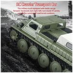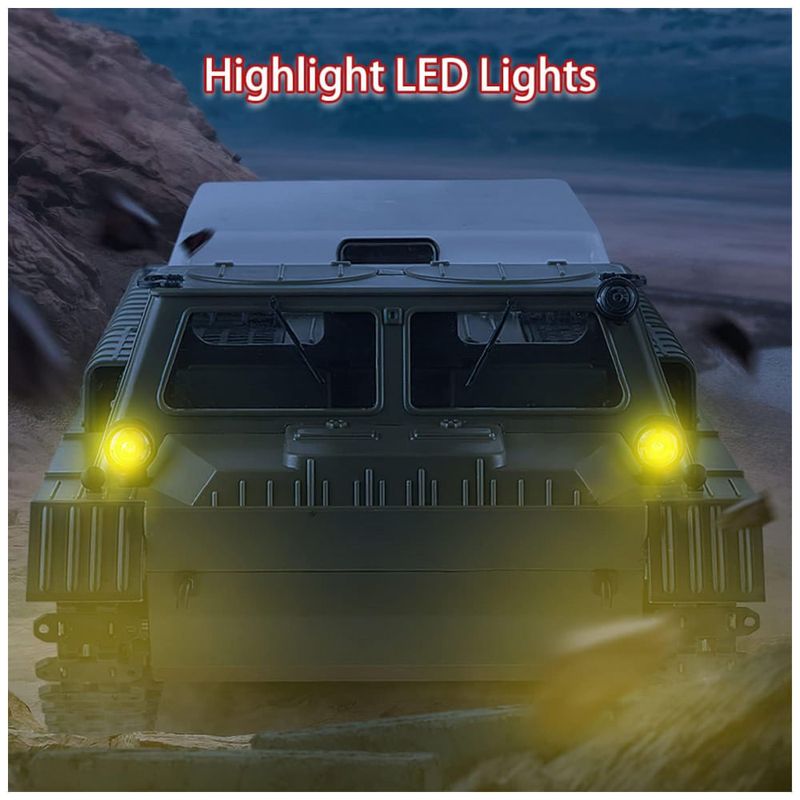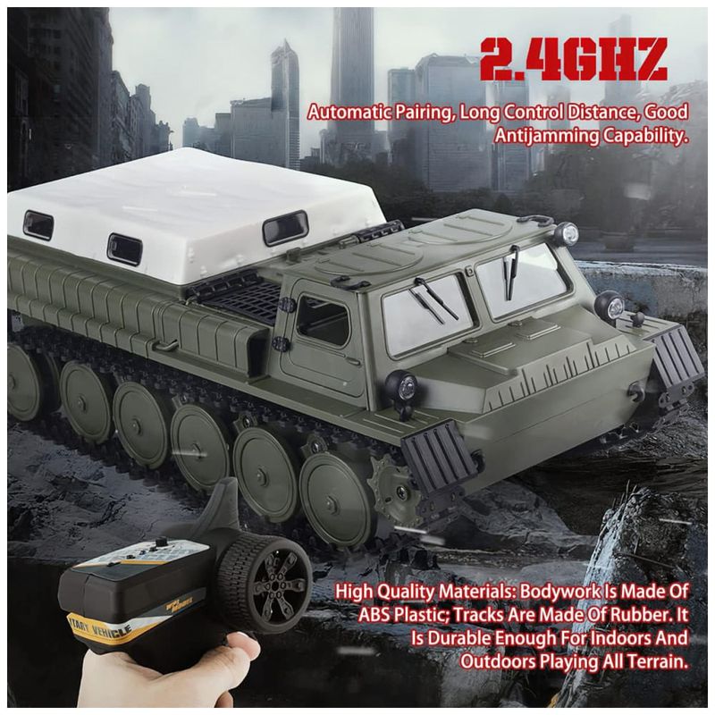 Este é um caminhão militar equipado com trilhos, ideal para corridas em terrenos off-road ao ar livre. O sistema de controle remoto sensível possui funções de aceleração proporcional e controle de direção, permitindo que os jogadores controlem a velocidade e ajustem a direção pelo controlador. O emparelhamento automático de alta frequência de 2,4 GHz garante longa distância de controle e boa capacidade antijamming, o que significa que vários caminhões podem ser usados simultaneamente sem interferência. A carroceria é feita de plástico ABS e as trilhas são feitas de borracha, tornando este caminhão durável o suficiente para jogar em todos os terrenos em ambientes internos e externos. A bateria recarregável de 7,4 V 500 mah incluída pode fornecer 15 a 20 minutos de tempo de reprodução, com um tempo de carregamento de 2 horas.