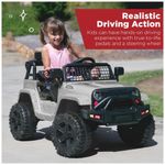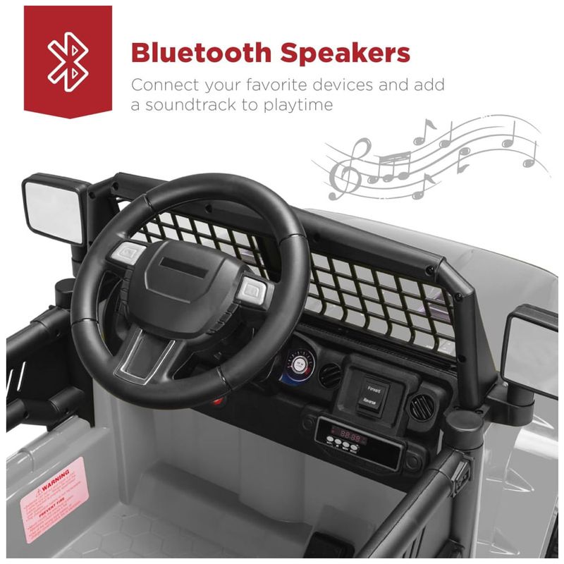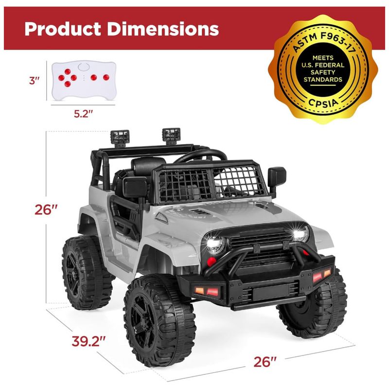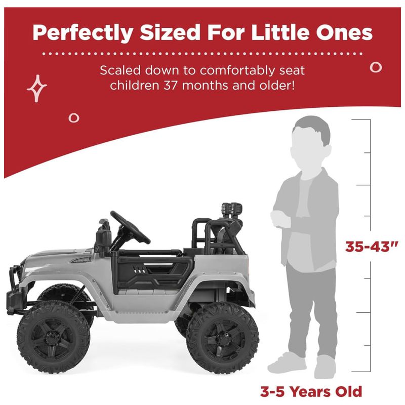 Este pequeno, porém poderoso caminhão elétrico é perfeito para crianças a partir de 3 anos que querem começar a dirigir como os adultos! Possui um design realista de 12V com cinto de segurança ajustável, faróis de LED brilhantes, portas traváveis e para-brisa gradeado para estilo off-road. Equipado com um motor de 12V e pneus de tração para rodar em diferentes terrenos. Permite que a criança dirija manualmente ou use o controle remoto para os pais guiarem com segurança, com controles de avanço e ré. Possui rodas de plástico que nunca esvaziam, sistema de suspensão por molas e velocidade máxima segura de 4,5 km/h para passeios suaves em aventuras ao ar livre. Além disso, possui uma saída AUX para as crianças conectarem dispositivos de mídia e dirigirem enquanto curtem sua própria seleção de música. Dimensões totais: 99,7cm comprimento x 66cm largura x 66cm altura. Capacidade de peso: 27,6 kg.