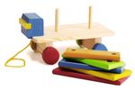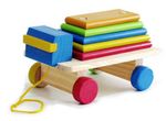Caminhão com 5 retângulos coloridos de tamanhos diferentes. A criança pode empilhar os retângulos ou colocá-los no caminhão e puxar. Estimula a coordenação motora e visual, discriminação de cores e quantidades.
