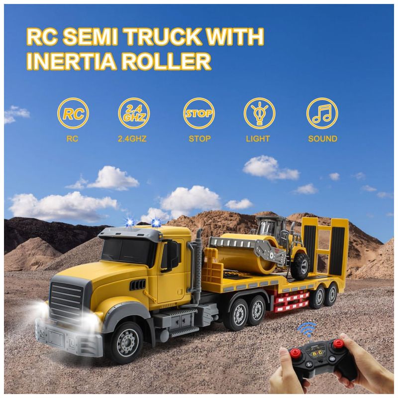 Com este caminhão RC semi-realista, as crianças podem vivenciar a emoção de operar um verdadeiro caminhão. Com funções avançadas de 6 canais, é possível conduzi-lo para frente, para trás, girar para esquerda e direita, controlar faróis e luzes do teto. Além disso, oferece três opções de músicas para uma experiência de jogo envolvente, especialmente para crianças em idade pré-escolar. Equipado com um motor robusto e transmissor 2.4GHz, oferece potência forte e controle preciso, permitindo rebocar facilmente vários veículos até 30 metros de distância. Com este caminhão em escala 1:24 de 68,5 cm de comprimento, as possibilidades são infinitas, permitindo arrastar diferentes veículos como carros, escavadeiras e caminhões de bombeiros. Vem com duas baterias recarregáveis de alta qualidade, garantindo diversão prolongada. Possui trailer destacável, possibilitando o transporte de diversos veículos, estimulando a criatividade e cenários de simulação.