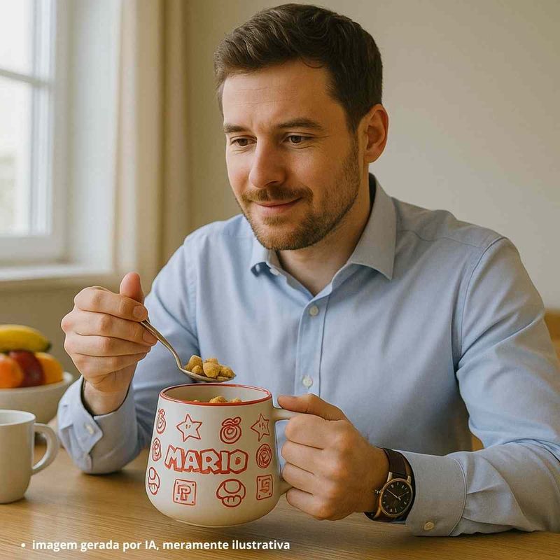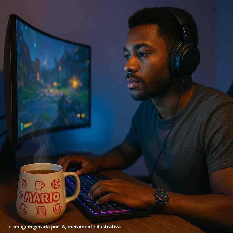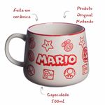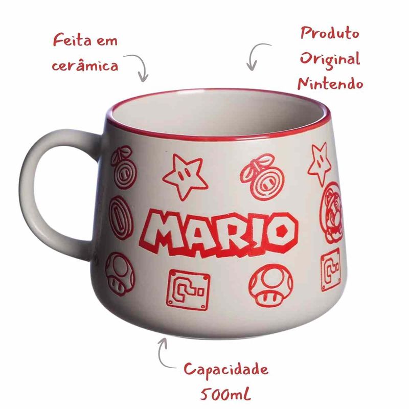 Produzida em cerâmica de alta qualidade, ela possui capacidade de 500ml, ideal para suas bebidas favoritas — seja café, chá ou chocolate quente. A estampa traz elementos icônicos do jogo, como o Mario, cogumelos e blocos, tornando essa peça um verdadeiro item de coleção.