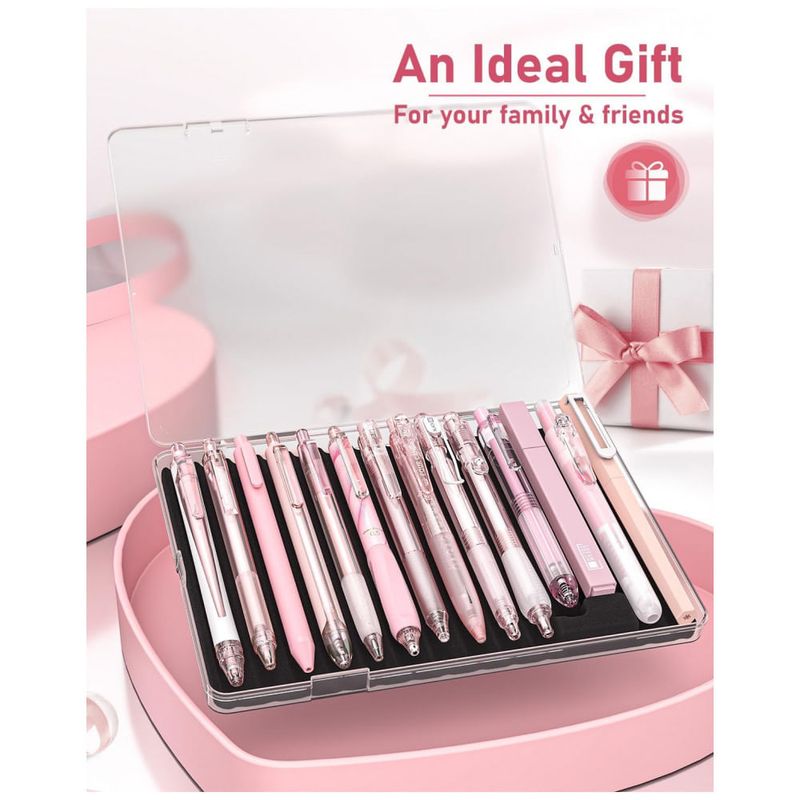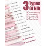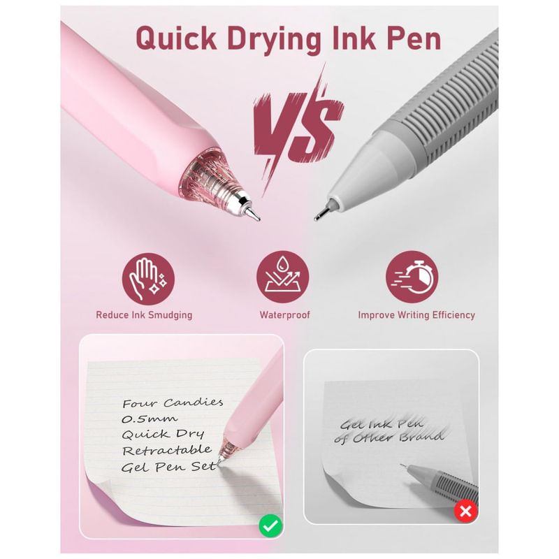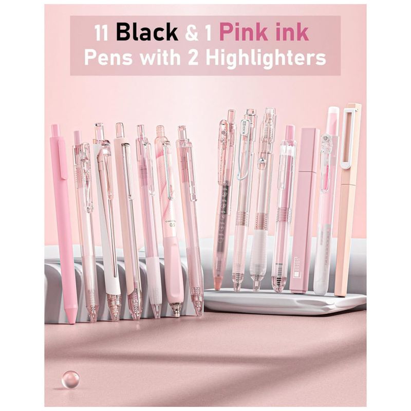 As canetas utilizam tinta em gel de secagem rápida com ponta fina de 0,5 mm, adequada para notas em espaços reduzidos, preenchimento de formulários, desenhos simples e escrita em planners. Cada ponta é selada por cera protetora para evitar ressecamento, devendo o lacre ser removido antes da primeira utilização.