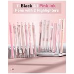 Cor da tinta: Preta (11 canetas) e rosa (1 caneta); marcadores em cores pastel coordenadas