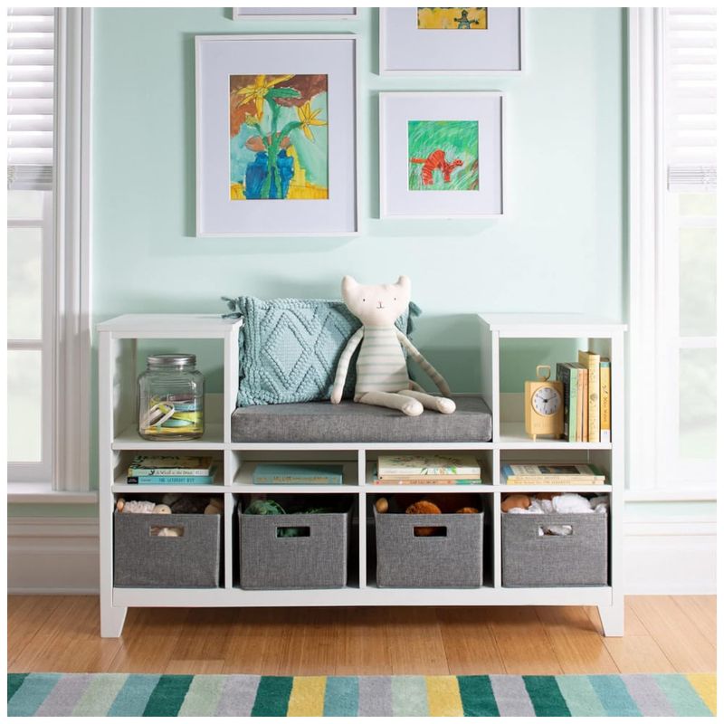 O Cantinho de Leitura Infantil Martha Stewart em branco linho é um organizador de livros e armazenamento em formato de banco com assento almofadado, construído em combinação de madeira de bétula e madeira engenheirada para resistência estrutural. Apresenta bordas arredondadas e acabamento de limpeza simples com pano seco, incluindo 6 prateleiras de dimensões variadas e 4 prateleiras com cestos de tecido para armazenamento modular de itens. A estrutura de pernas retas suporta até 90,7 kg com capacidade para 2 assentos, requer montagem com ferramentas, ferragens e instruções fornecidas. Mede 129 cm de comprimento x 40 cm de largura x 76 cm de altura, com altura do assento de 54 cm, ideal para configuração em quartos ou áreas de brincadeiras.