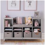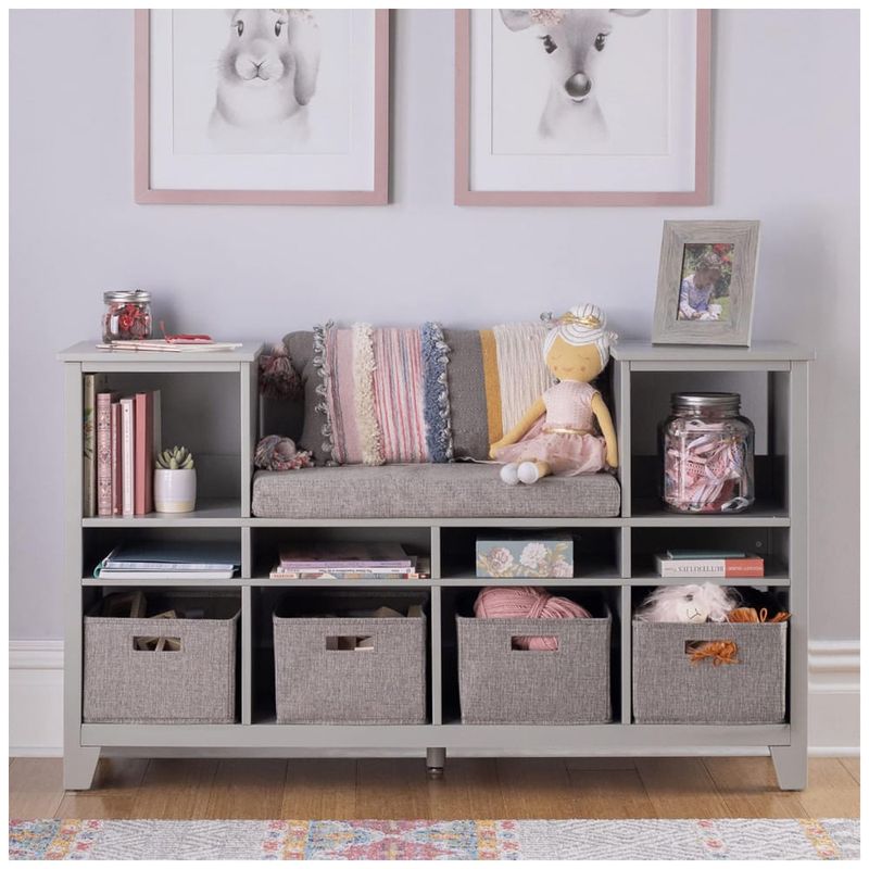 O Cantinho de Leitura Infantil Martha Stewart em cinza é um organizador de livros e armazenamento em formato de banco com assento almofadado, fabricado em combinação de madeira de bétula e madeira engenheirada para maior durabilidade. Possui bordas arredondadas e acabamento fácil de limpar, com 6 prateleiras de tamanhos variados e 4 prateleiras equipadas com cestos de tecido removíveis para organização modular. O design inclui estrutura aberta para acesso rápido, compatível com espaços de quarto ou sala de brincadeiras, com montagem requerida utilizando ferramentas, ferragens e instruções inclusas. Mede 129 cm de comprimento x 40 cm de largura x 76 cm de altura, com altura do assento de 54 cm, suportando até 90,7 kg distribuídos. Produzido pela Guidecraft, modelo com UPC 716243769009, em estilo de madeira natural.?