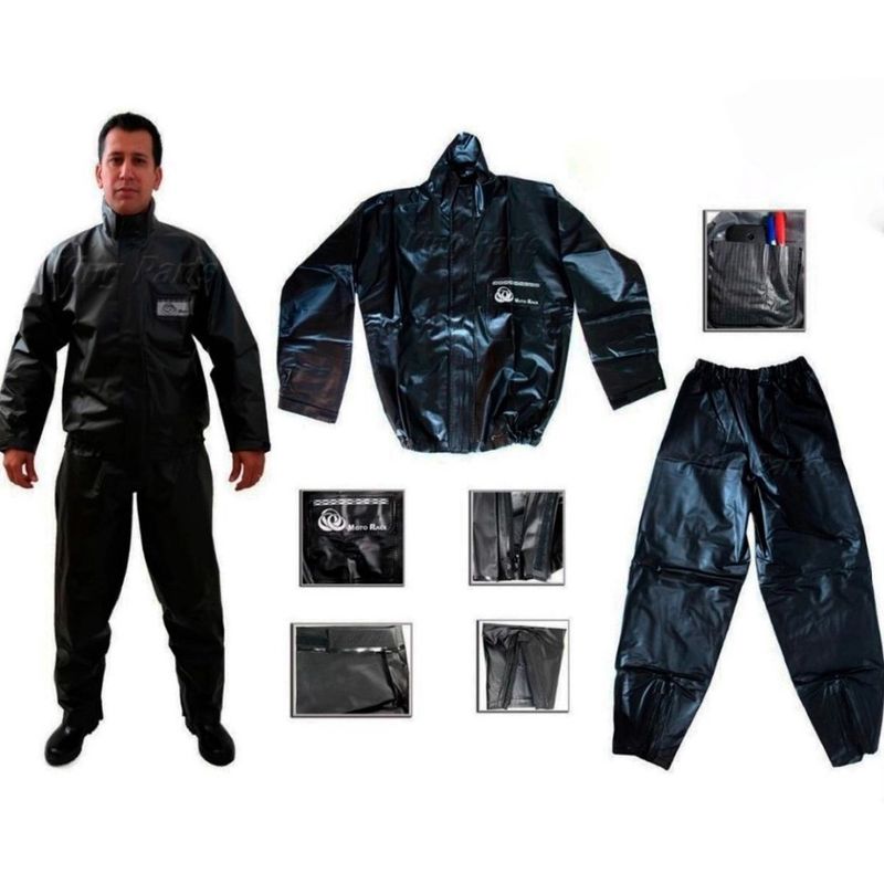 - Calça: confeccionada em tecido sintético plastificado em pvc com forro, costura por solda eletrônica, elástico na cintura, zíper nas barras para ajuste.