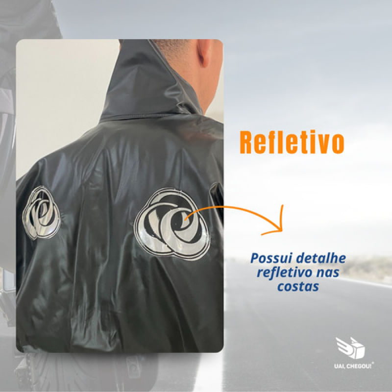 - Jaqueta: confeccionado em tecido sintético plastificado em pvc com forro, costura por solda eletrônica, faixas refletivas (peito e costas), bolso interno e externo, ajuste nos punhos por velcro, fechamento frontal duplo por zíper e velcro, elástico na cintura. Comgola.