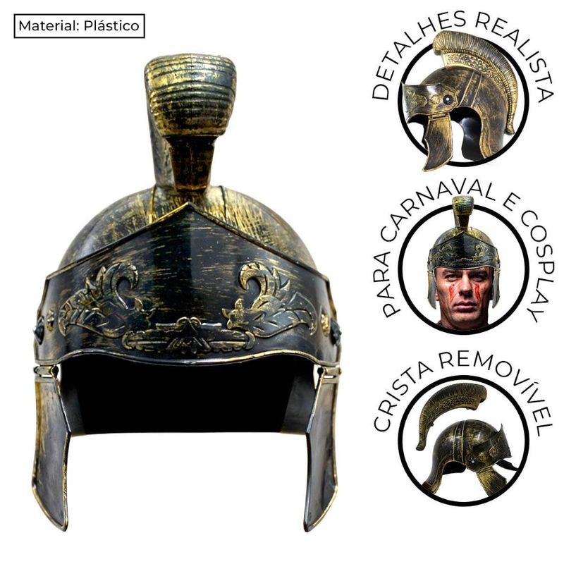 Transforme-se em um verdadeiro gladiador com o Capacete de Guerreiro Romano, perfeito para fantasias de Carnaval, eventos temáticos ou peças teatrais. Disponível nas cores dourada ou prata, esse acessório detalhado conta com uma crista removível, proporcionando versatilidade ao seu visual. Com 25 cm de altura (sem a crista) e ajustado para cabeças de 57 cm de circunferência, ele combina conforto e estilo histórico. Ideal para quem busca um visual autêntico e imponente, este capacete é o complemento perfeito para destacar sua fantasia! Impressione com o Capacete de Guerreiro Romano, um acessório que combina história, estilo e diversão!