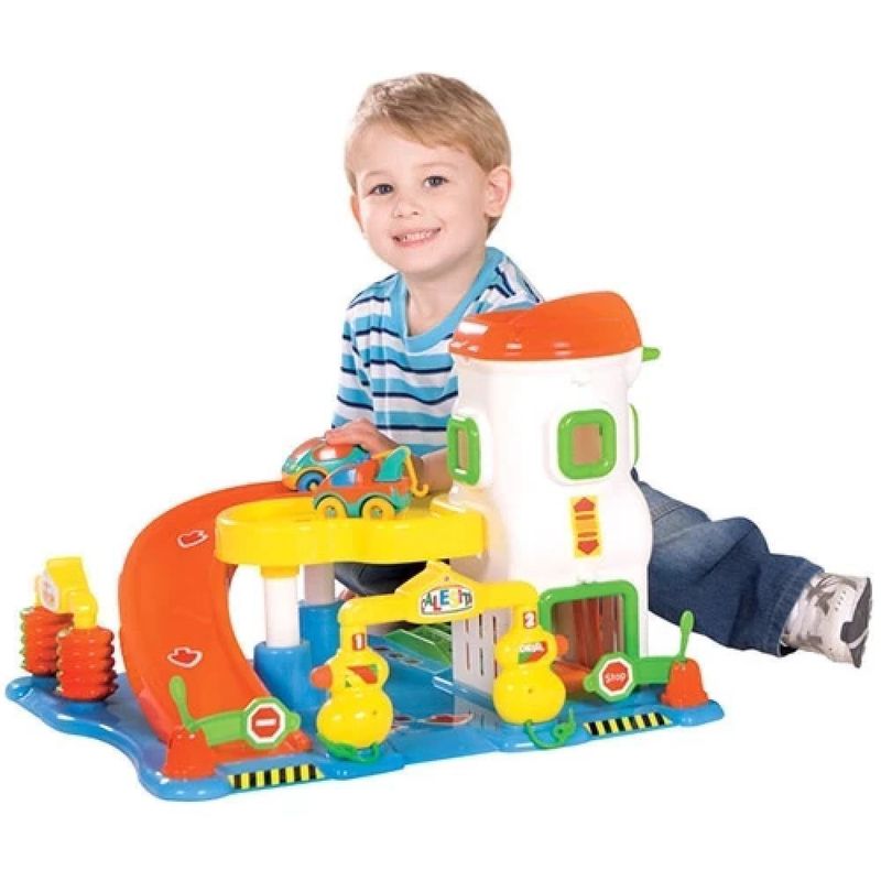 É só colocar o carrinho para subir pelo elevador para chegar ao estacionamento superior e para a brincadeira ficar ainda mais divertida o carrinho desce pela rampa em alta velocidade. É uma plataforma super colorida e recheada de interações, vem com um carrinho e um guincho.