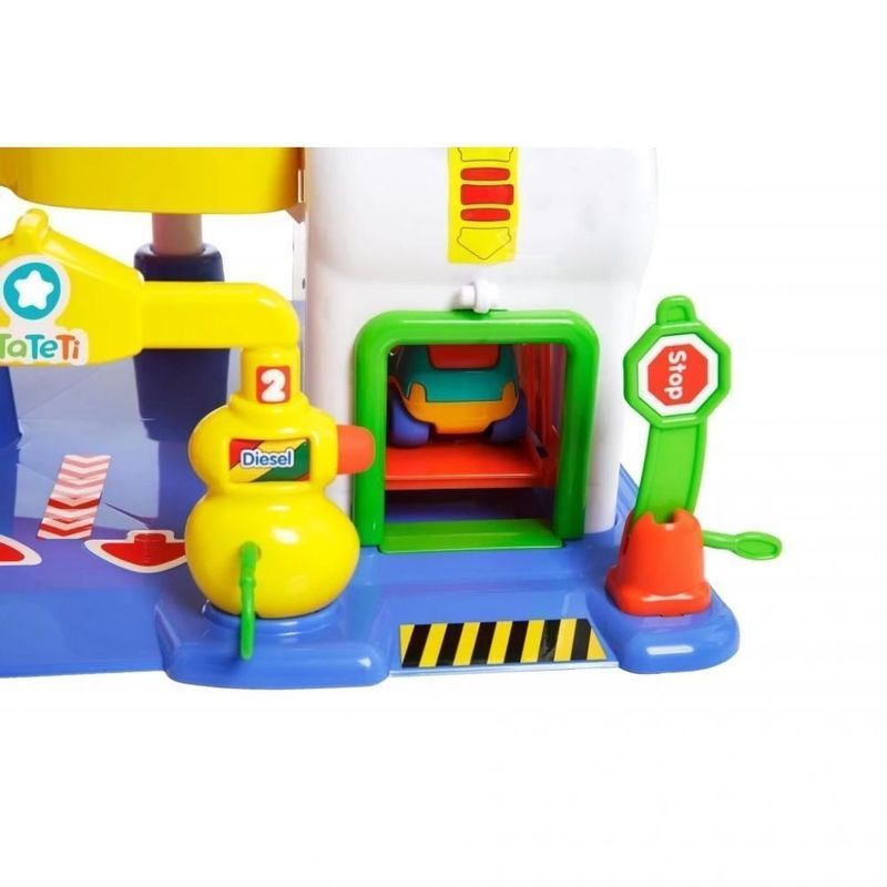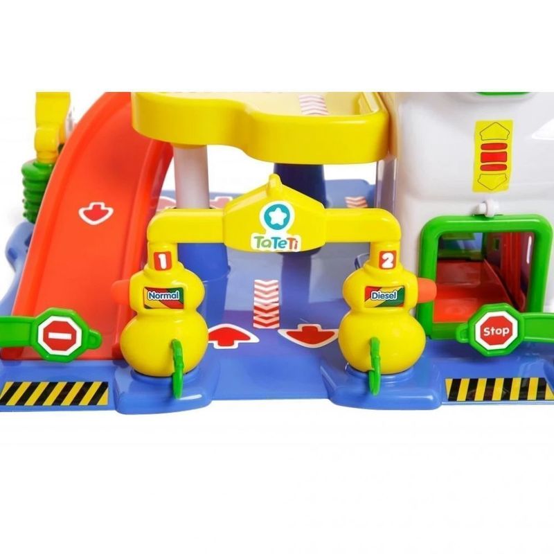 Um posto de gasolina completo! Acompanha lava rápido, troca de óleo, duas bombas para abastecer, é só escolher qual combustível girando o botão lateral da bomba e abastecer. Tem também uma balança com elevação que dá acesso ao elevador divertido.
