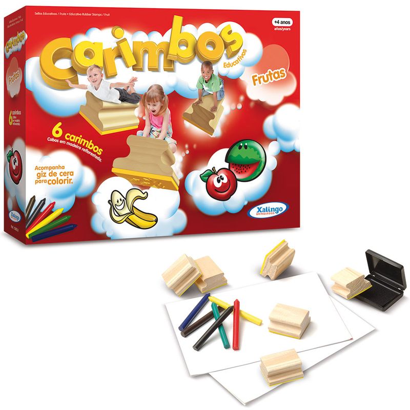 Modelo com 8 tipos de frutas diferentes, banana, maça e muito mais. A linha de carimbos Educativos Xalingo é composta por 8 modelos diferentes para você colecionar. Cada tema vem com 6 carimbos de madeira, 01 almofada com tinta atóxica, giz de cera e um 01 bloco de papel. São desenhos superdivertidos que vão encantar a meninada. Indicado para crianças acima de 4 anos.