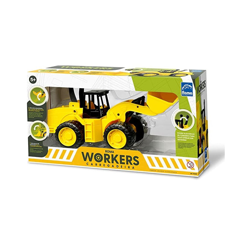 A Roma Workers Carregadeira é articulada, possui duas alavancas para a criança levantar e abaixar o braço de elevação, como também bascular a caçamba. Produto com acabamento perfeito e extremamente realista!