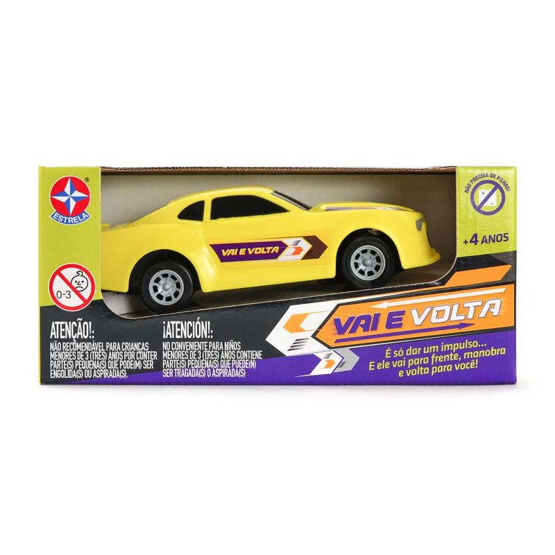 Vai e volta é um classico Estrela que está de volta, com uma carcaça mais moderna e atrativa para as crianças de hoje em dia. Além de possuir as mesmas funcionalidades e desempenho de sempre. Não usa pilhas. Vai, manobra e volta para o mesmo lugar!