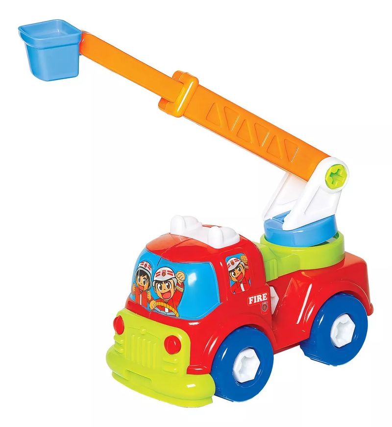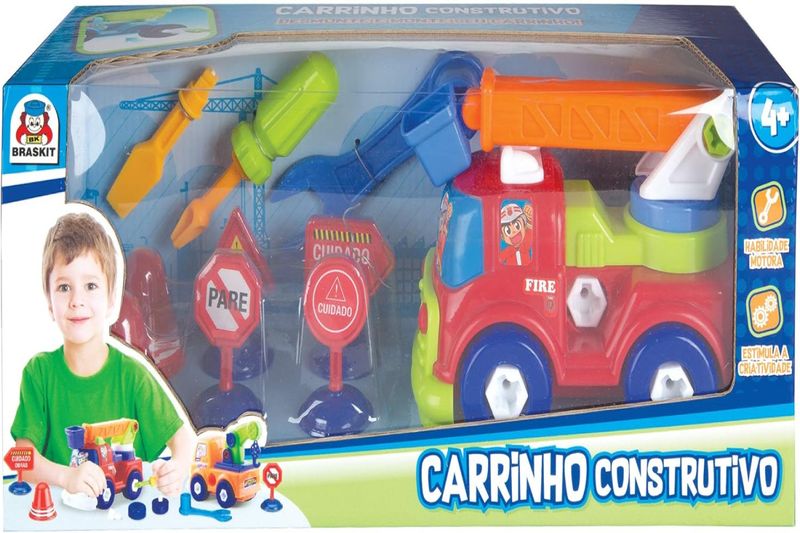 Carrinho para montar e desmontar com peças de fácil encaixe. Acompanha kit de ferramentas e acessórios de sinalização de trânsito.