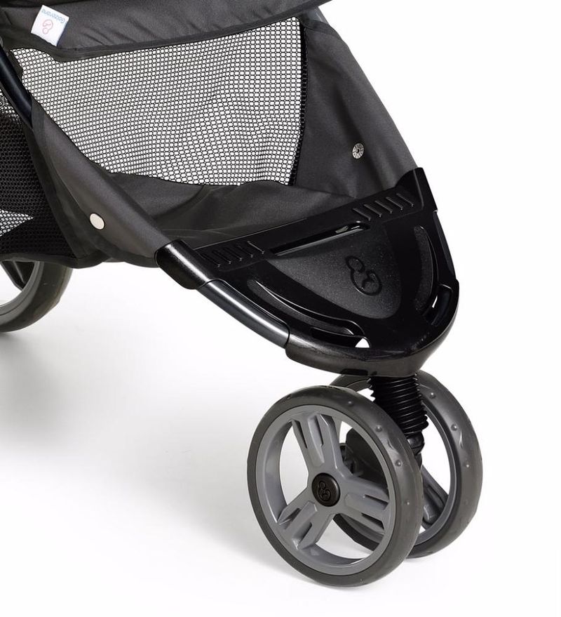 Seu encosto é regulável em 4 posições, com eixos dianteiro e traseiros removíveis, rodas dianteiras giratórias e 2 rodas traseiras com único sistema de freio. Ele acompanha bandeja com porta copos, removível e fácil encaixe, cinto de segurança 5 pontos, protetor de ombro e capota removível e retrátil.